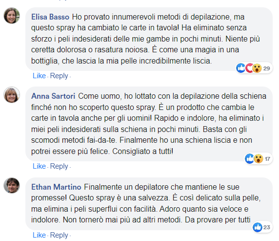 "Questo spray depilatorio è facile da usare. È fantastico quando devo solo eliminare i peli dalle mani. Indolore e senza irritazioni! Sono stanca di radermi, quindi questo prodotto era esattamente quello di cui avevo bisogno!".